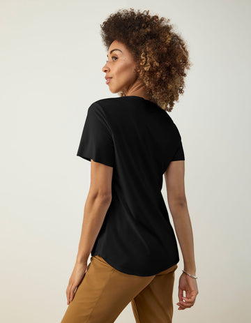 Cool commuter. Our best-selling t-shirt, now with a slenderizing v-neckline. Wrinkle-free, stain resistant, and perfect for early morning commutes.