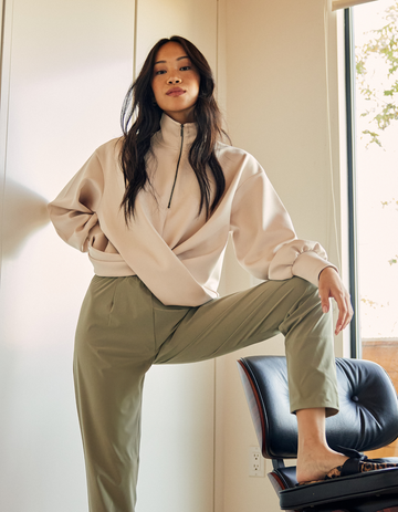 Our cult-favorite Like a Boss fabric, with a twist. This buttery soft, beautifully sculptural silhouette features a high neck and quarter-zip design.
