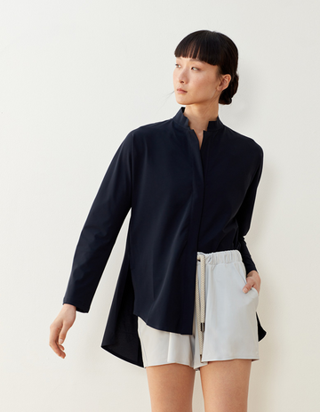 The most flattering button up you'll ever own. This modern twist on a boyfriend shirt features a relaxed silhouette, a chic mandarin collar, and a silky hand-feel. Loose Fit, Long Length.